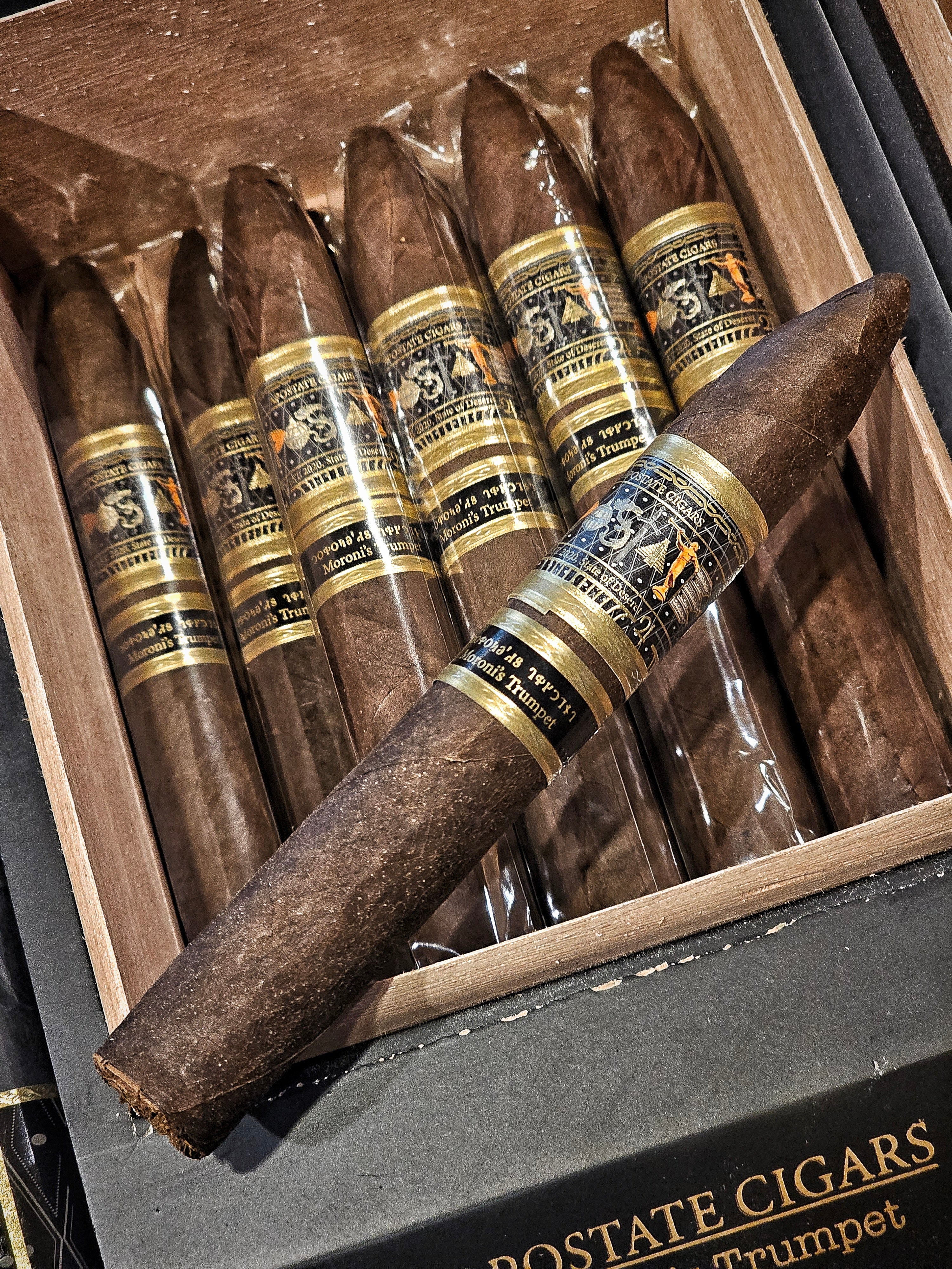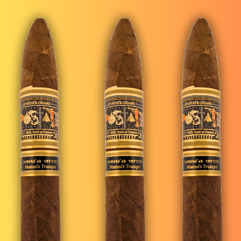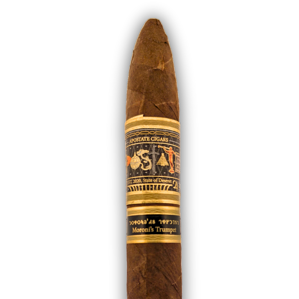 The Moroni's Trumpet is Apostate Cigars' most robust offering, named after the angel Moroni, a figure significant in Latter-day Saint tradition. This 6¼ x 56 torpedo is meticulously handcrafted at Tabacalera Palma in the Dominican Republic, showcasing a blend that delivers a rich and evolving smoking experience.