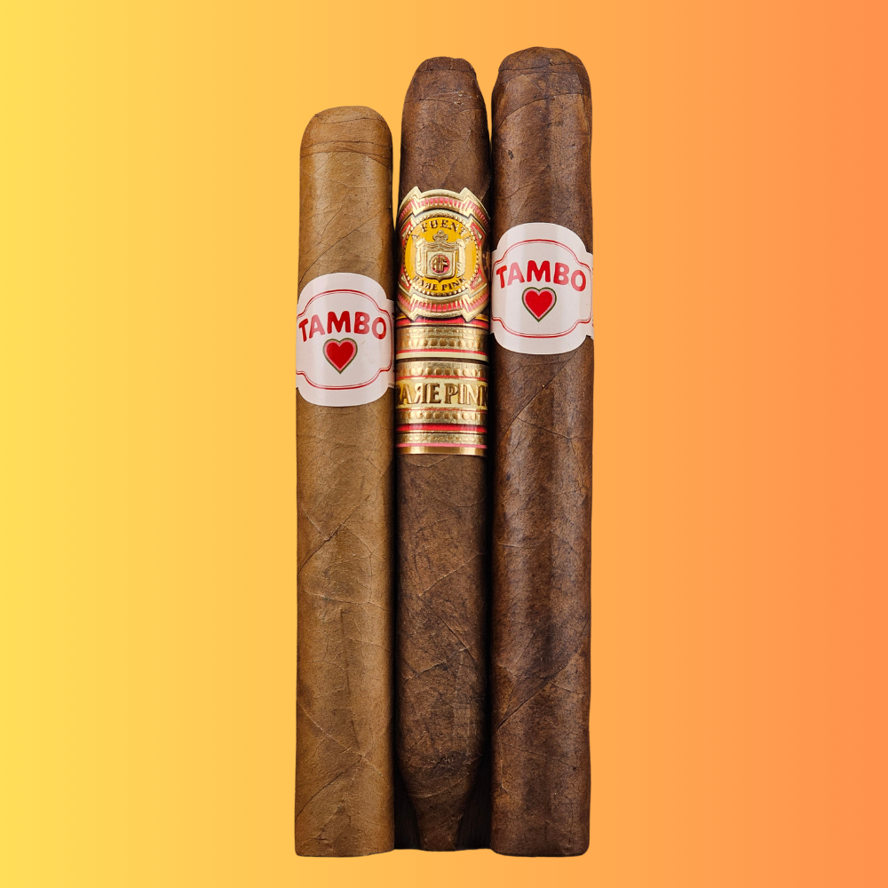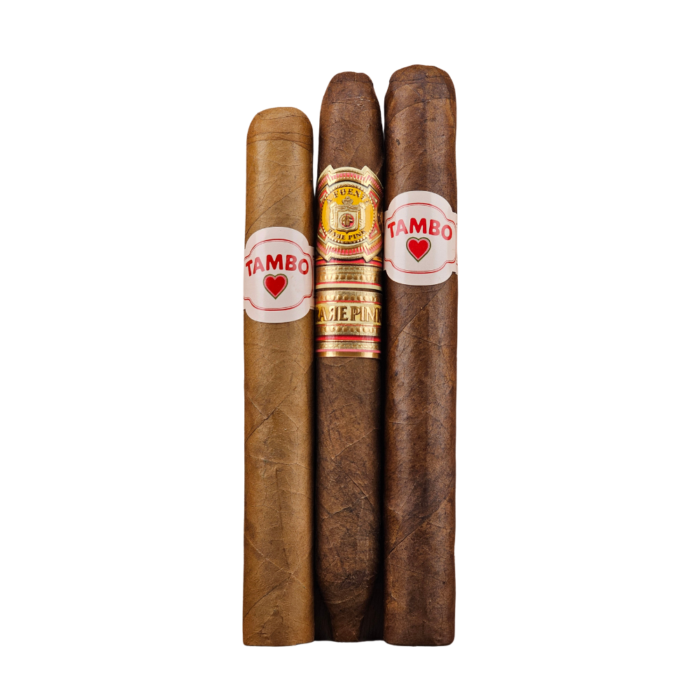 A refined three-piece flight. Start with Tambo Connecticut Corona Gorda (silky cream and cedar), step up to Rare Pink Signature (Ecuador Habano sparkle with cocoa/pepper), and finish with Tambo Habano Toro (Habano 2000 over Indonesian Sumatra, DR & PA fillers) for toasted nuts, baking spice, and a touch of cocoa. Boutique balance at everyday value.