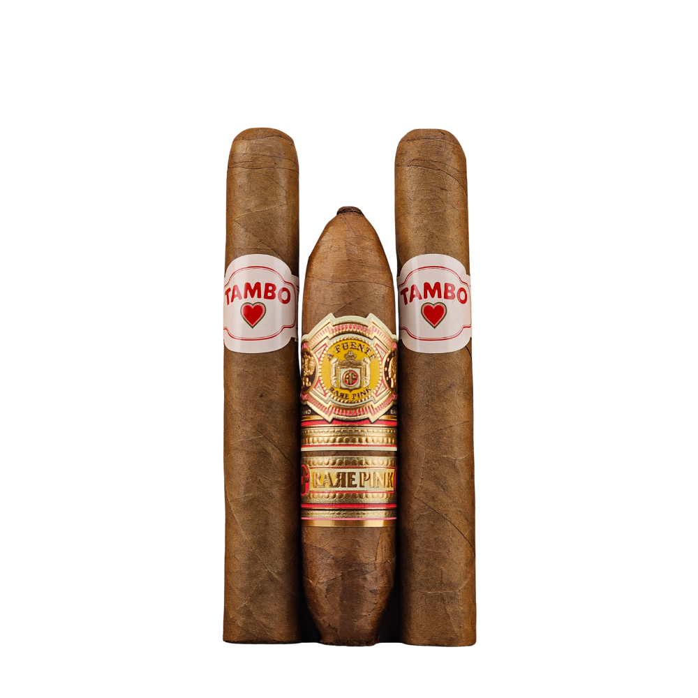 Cream-meets-crimson. Two Tambo Connecticut Robustos (silky Ecuadorian Connecticut over a smooth Dominican core) pair with an Arturo Fuente Rare Pink Queen of Hearts (Ecuador Habano over DR/Nica) for a side-by-side of sweet cream, toasted cedar, and lively spice. Handcrafted in Tamboril, DR and Tabacalera Fuente—perfect for gifting or a comparative tasting.
