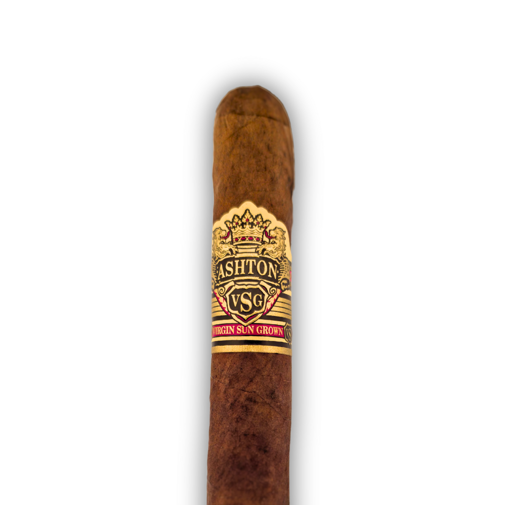 e Ashton Virgin Sun Grown (VSG) Corona Gorda is a 5¾ x 46 vitola that delivers the bold, full-bodied depth of the VSG line in a slightly slimmer format, enhancing its strength and complexity. Crafted by the Fuente family in the Dominican Republic, this cigar features a dark, oily Ecuadorian Sumatra wrapper grown exclusively for Ashton on a private estate, wrapped around a hearty blend of aged Dominican binder and fillers.