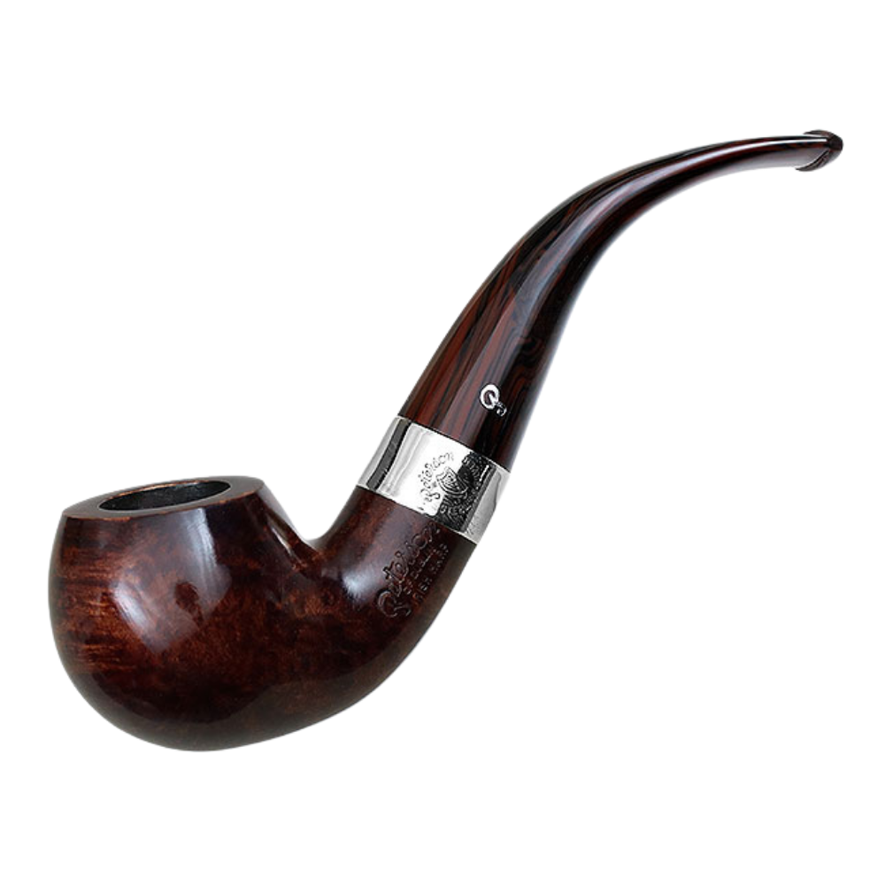 Celebrating the iconic Celtic harp, or cláirseach in Irish, Peterson's Irish Harp series dresses pipes in a reserved, rustic aesthetic that's marked by a walnut stain, a matching acrylic mouthpiece, and a gleaming accent of silver. Offered in either a smooth or sandblasted finish, these pipes showcase Peterson's superlative silverwork, timeless classicism, and individualized style, as evidenced by this smooth 03 Bent Apple.